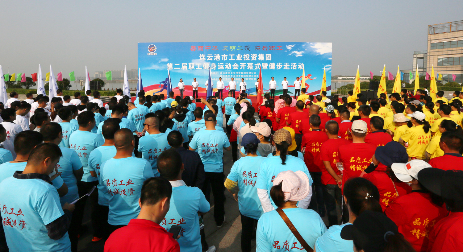 金秋十月,丹桂飄香。10月24日上午,美麗的徐圩新區(qū)云湖廣場彩旗招展,歌聲飛揚(yáng),為慶祝中華人民共和國成立70周年,豐富職工業(yè)余文化生活,由集團(tuán)公司、集團(tuán)公司工會(huì)主辦,徐圩投資公司承辦的集團(tuán)第二屆職工健身運(yùn)動(dòng)會(huì)開幕式暨健步走活動(dòng)在這里隆重舉行。集團(tuán)公司黨委書記、董事長楊龍宣布第二屆職工健身運(yùn)動(dòng)會(huì)開幕,并為健步走活動(dòng)發(fā)令??偨?jīng)理胡建明致開幕詞。工會(huì)主席劉承志主持開幕式。 本次運(yùn)動(dòng)會(huì)圍繞“美麗中華·文明工投·快樂職工”活動(dòng)主題,來自全公司各條戰(zhàn)線的17支代表隊(duì)1200多人次的運(yùn)動(dòng)員參加拔河、跳繩、乒乓球、健步走等項(xiàng)目的角逐。他們以勇奪第一、超越自我的競賽精神和攜手奮進(jìn)、合力拼搏的競賽風(fēng)尚,充分展示工投人追求卓越、共建和諧的優(yōu)秀精神風(fēng)貌。本次運(yùn)動(dòng)會(huì)將對個(gè)人單項(xiàng)比賽前六名、集體項(xiàng)目比賽前三名及道德風(fēng)尚獎(jiǎng)獲得者給予表彰。