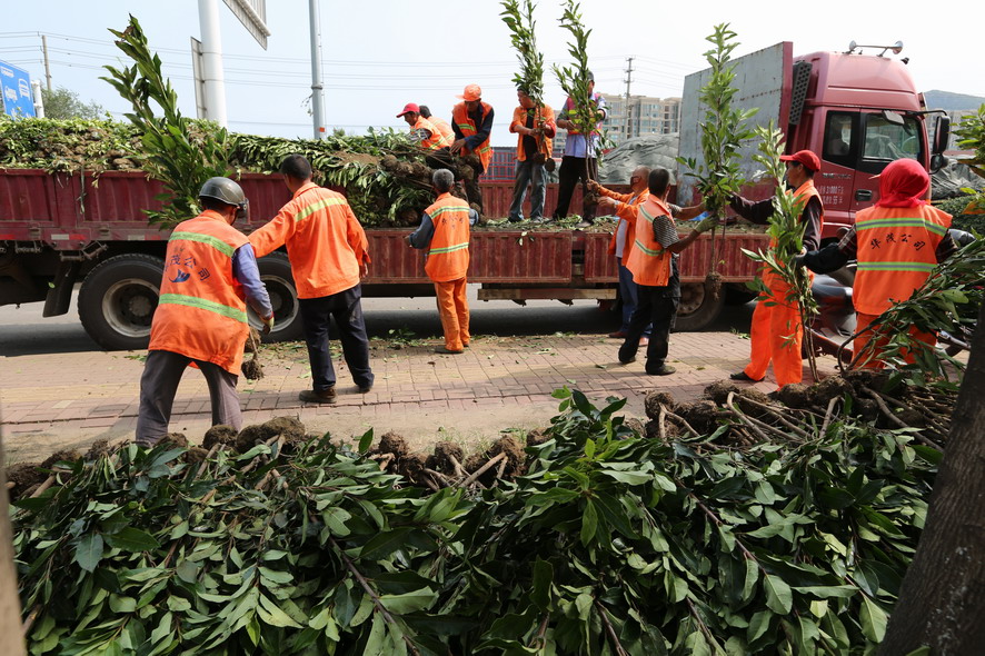 新光路鐵路橋至港城大道段南側(cè)綠化帶,因為人為踩踏、車輛碾壓導致綠化斑禿損壞嚴重,為盡快恢復綠化原貌,改善市容市貌。8月18日,裕升、裕欣養(yǎng)護公司組織80多名綠化工,從早上6點一直干到下午6點,卸苗、運苗、挖坑、插苗,烈日酷暑下奮戰(zhàn)一整天,中午在樹陰下吃點盒飯,喝點礦泉水,繼續(xù)工作,橘黃色工作被汗水浸透、被烈日烤干,這樣有好幾個來回?!敖裉煳覀円谶@片綠化補植紅葉石楠、金森女貞等模紋小苗1萬余株,紅葉石楠球等灌木110株,有效改善該路段綠化植被,提升城市形象,我們還要在黃海續(xù)道補植草坪近30000平方,在這條1000多米長的路段,有車輛維修點50多家,車輛出入,對路邊綠化帶傷害非常大,這一路段也是環(huán)衛(wèi)整治長期存在的‘老大難’,這次,在開發(fā)區(qū)行政執(zhí)法部門的配合下,我們要重新種植草坪,對這一‘老大難’路段植被進行恢復,另外德蘭南路、東路補植苗木近80萬元的綠化工程也已開工上土整土,接著要栽苗,根據(jù)開發(fā)區(qū)創(chuàng)衛(wèi)部署要求,上述這些事情必須在8月底完成,所以說時間相當緊,職工們都冒著高溫,加班加點搶進度?!惫靖笨偨?jīng)理郁宏峰說。