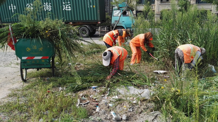 在昌圩湖環(huán)湖路南側(cè)一處公共廁所處,裕升養(yǎng)護公司20多名環(huán)衛(wèi)保潔工人正在清理公廁周邊的雜草、建筑垃圾,有的在割草、有的在搬磚、有的在推車,一個個汗流浹背,忙得不亦樂乎。正在現(xiàn)場忙碌的保潔大隊長劉保軍對筆者說:“這一塊段還沒有交給我們養(yǎng)護,一直無人管理,雜草叢生,成為建筑、裝修垃圾的堆放地,根據(jù)開發(fā)區(qū)創(chuàng)衛(wèi)環(huán)境衛(wèi)生無死角要求和華茂公司生產(chǎn)技術(shù)部門指令,我們裕升養(yǎng)護公司承擔這一區(qū)域環(huán)境衛(wèi)生突擊整治任務,從綠化保潔班組抽調(diào)20多人來搞突擊,大家面對天氣炎熱、工作量大、清理困難等因素,發(fā)揚不怕吃苦、敢打硬仗的華茂精神,奮戰(zhàn)在突擊現(xiàn)場,每個人都汗流不止,工作服全被汗水浸透,昨天我們已在這里整整干了一天,由于垃圾量大、雜草面積大,我們動用了裝載機等機械設備,運雜草的三輪車跑近百趟,清理建筑、裝修等垃圾數(shù)十噸。估計今天下午能夠全部結(jié)束。”