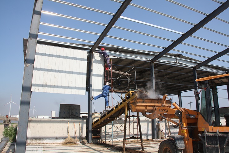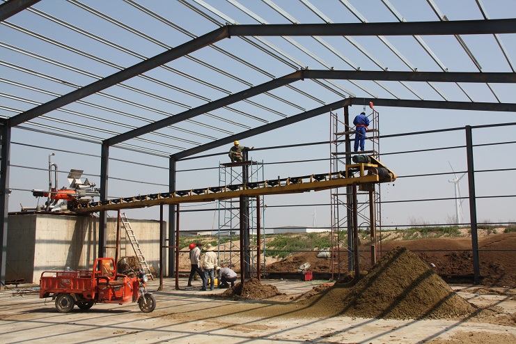 5月18日,位于北北歐農(nóng)莊生豬養(yǎng)殖廠旁邊的綠淮肥業(yè)公司有機(jī)肥生產(chǎn)基地,一個鋼結(jié)構(gòu)廠房即將完工,只見機(jī)聲轟鳴、焊花飛濺,機(jī)電服務(wù)公司的工人在勞模王緒華帶領(lǐng)下正在焊接鋼結(jié)構(gòu)件,而正在建設(shè)施工中的廠房內(nèi),兩條有機(jī)肥生產(chǎn)線運(yùn)轉(zhuǎn)不停,沒有因廠房建設(shè)而停產(chǎn),廠房旁邊的一臺挖掘機(jī)正在整平場地,一邊建設(shè),不邊生產(chǎn),一派紅火景象。