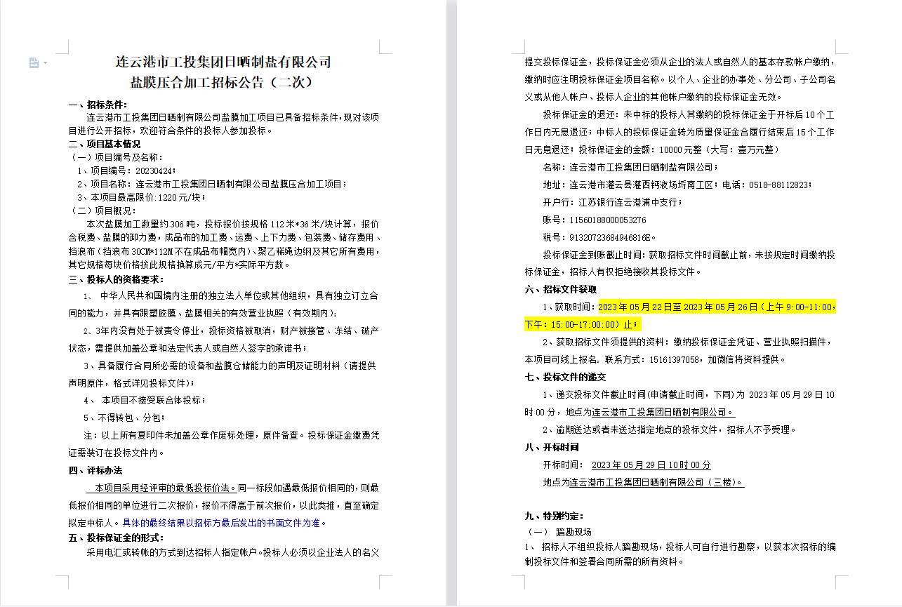 連云港市工投集團(tuán)日曬制鹽有限公司鹽膜壓合加工招標(biāo)公告(二次)