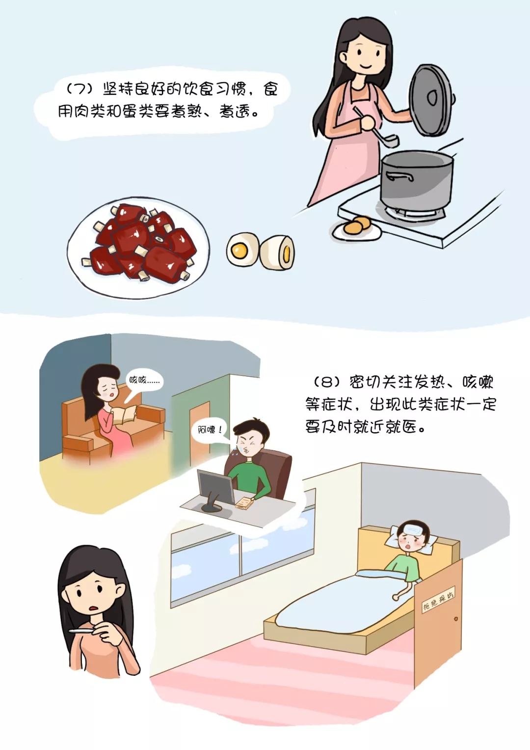 (7)堅持良好的飲食習慣,食用肉類和蛋類要煮熟、煮透。