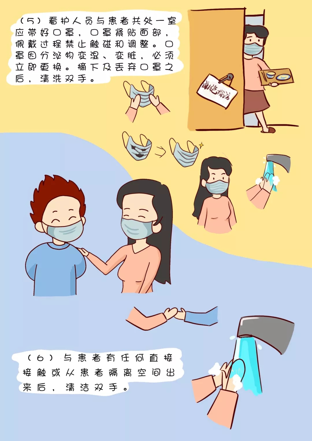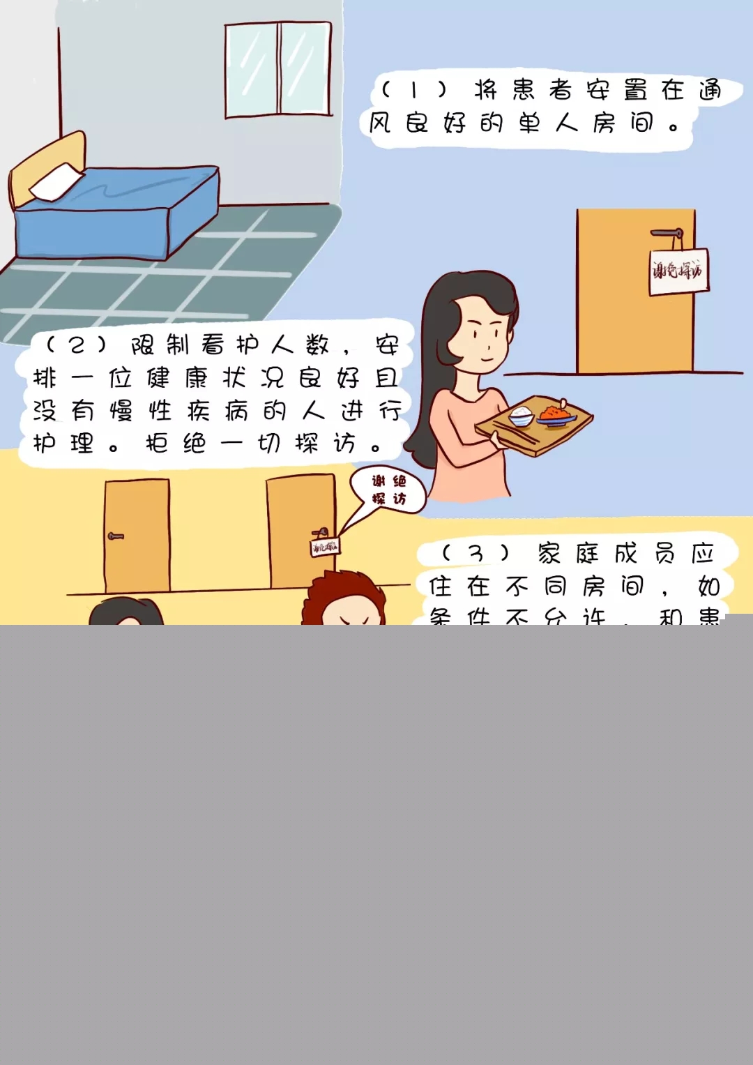(2)限制看護人數(shù),盡量安排一位健康狀況良好且沒有慢性疾病的人進行護理。拒絕一切探訪。