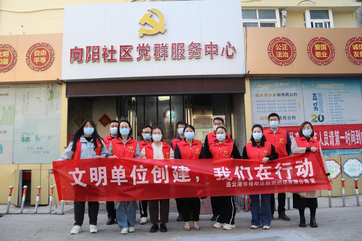 為發(fā)揚(yáng)志愿者精神,響應(yīng)海州區(qū)文明辦開展創(chuàng)建全國(guó)文明城市“文明單位創(chuàng)建我們?cè)谛袆?dòng)”活動(dòng),11月4日,金融板塊組織17名黨員、積極分子、青年員工參加向陽社區(qū)志愿服務(wù)活動(dòng)。