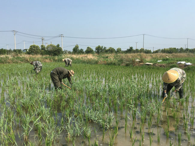 盛夏時節(jié),正是水稻生長關鍵期,生態(tài)種養(yǎng)中心的職工在烈日下手工拔除水稻間的雜草。為確保稻米的品質,中心堅持利用人工除草作業(yè),減少化學農藥的使用。 (莫宗剛)