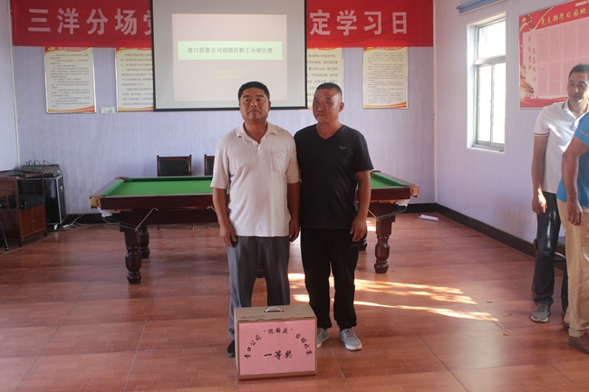 ? ? 26日的臺(tái)球比賽賽場(chǎng)設(shè)在三洋分場(chǎng)院內(nèi),賽場(chǎng)內(nèi)高懸大紅燈籠及條幅,為活動(dòng)增添了喜慶的氣氛。