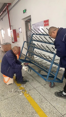 維修臺(tái)車時(shí),我當(dāng)起了孫師傅的下手,一邊將臺(tái)車穩(wěn)住不能傾倒,一邊看著孫師傅卸下每個(gè)車輪子并進(jìn)行仔細(xì)清理,不怕臟、不怕累,毫無怨言,一絲不茍,動(dòng)作利落,手法嫻熟,親身直面他的高效率和專業(yè)水平。他還對(duì)我詳細(xì)解說,讓我理解每個(gè)步驟的重要性和關(guān)鍵點(diǎn)。我們蔣姐也過來幫忙,不停的清掃臺(tái)車上清理出來的垃圾……