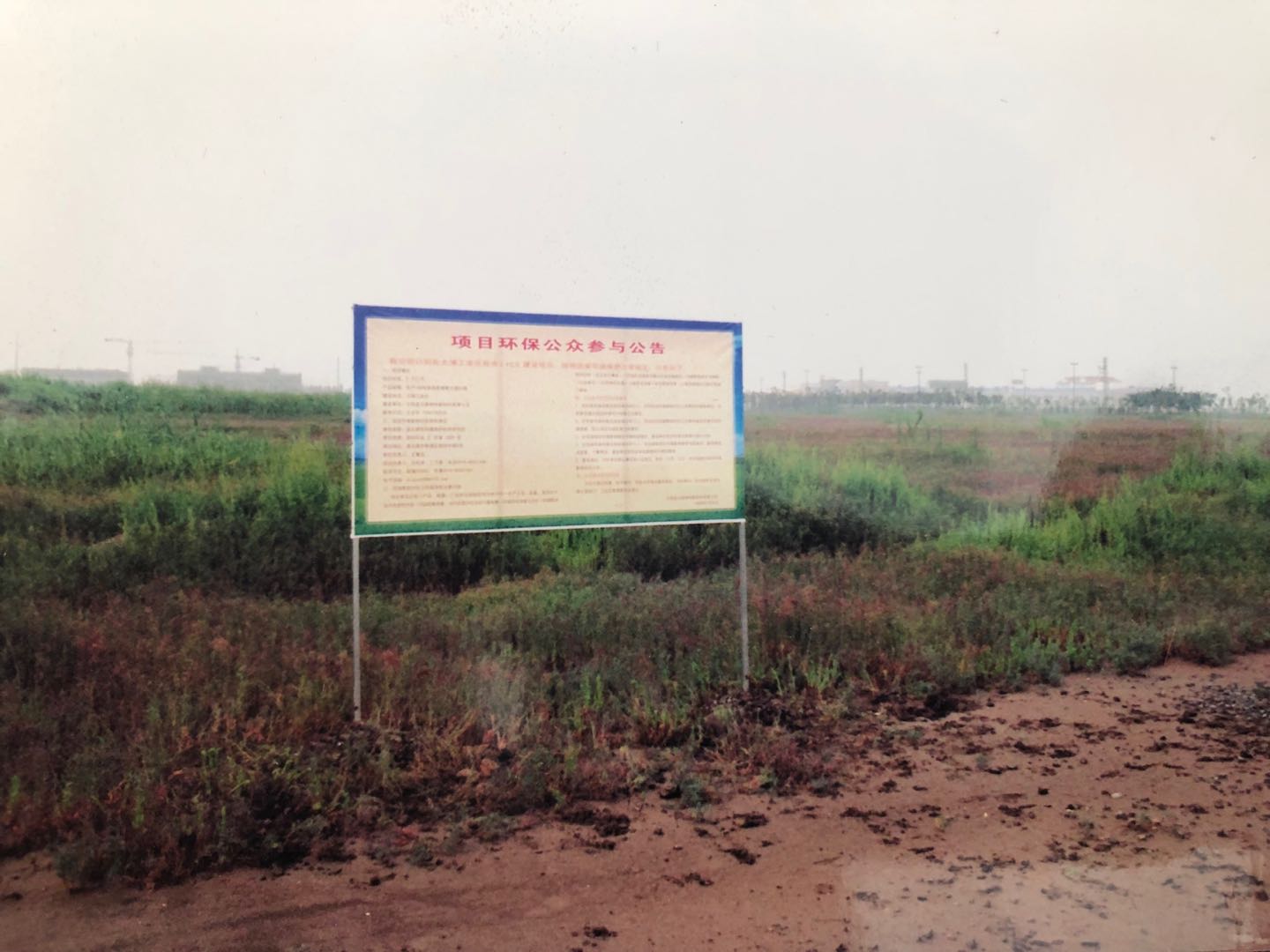 這是神特公司籌建時期的環(huán)評現(xiàn)場公示照片,是2008年8月底拍攝的。照片的重點部分是一個大牌子——項目環(huán)保公眾參與公告的牌子,位置大約在現(xiàn)在一期傳達(dá)室附近。做這樣的牌子是當(dāng)時環(huán)評的一個環(huán)節(jié),必須在建設(shè)場地進(jìn)行兩次公告,征求相關(guān)環(huán)境利益方的訴求。牌子的遠(yuǎn)方隱隱約約看見有些工廠和電力桿塔,牌子附近生長著茂密的堿蒿,一團團一簇簇,忽高忽低,可以看出地面是很不平整的。當(dāng)年豎牌子的時候,是雨后不久,地面較為泥濘,建設(shè)用地及周邊環(huán)境多多少少透射出一種蒼涼的感覺。