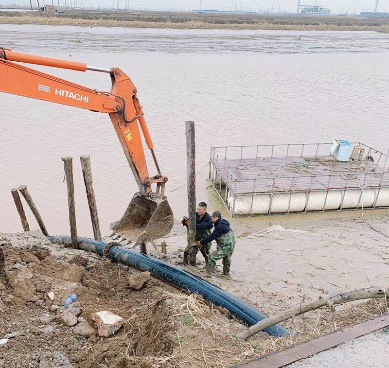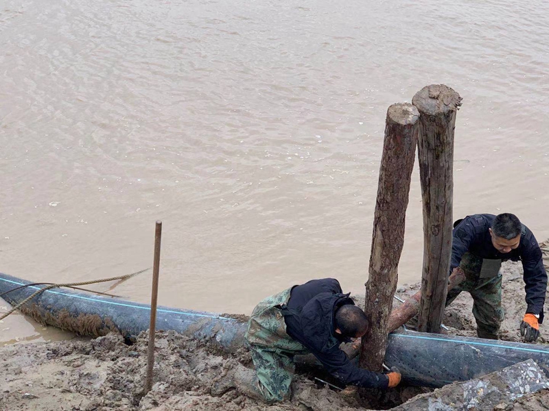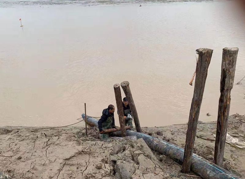 ?一想到昨天管道巡查到這里的情形,現(xiàn)在還讓人“心有余悸”!因管道地處善后河彎道處,常年的泄洪沖刮將河邊覆蓋管道的泥土沖刷卷走,使得岸邊泥土下原本穿越的PE315管道已經(jīng)暴露出來,退潮時(shí)的旋流不斷地沖撞著漂浮起來的鈣液管道,劇烈抖動(dòng)著的管道不時(shí)發(fā)出“噗噗的低吼”隨時(shí)可能折斷。埒子口潮河段是鈣液東輸灌西管道最長的一節(jié)過河穿越,全長約300米。穿越管道如果折斷在河底后果將不可想象、經(jīng)濟(jì)損失也是不可估量的,這一幕讓在場(chǎng)所有人員都為之捏了一把汗!