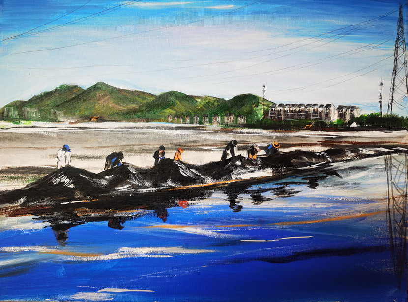 在這個(gè)屬于黨員的節(jié)日,我們脫下華麗的衣裳,全副裝備到達(dá)東灘,男同事們穿上水靴拿起鐵锨下到溝里,溝里淤泥已經(jīng)漫過(guò)了腿肚,女同事三五成群撿垃圾,抬浮板……背灼炎天光,力盡不知熱,在火熱的太陽(yáng)下,我們頂著一身如雨的汗水,只為能在熱火朝天的奮斗中,給彼此一份清涼的懷念。