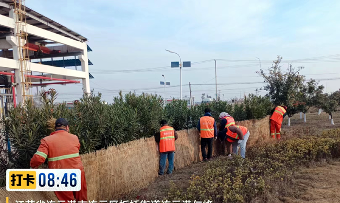 風(fēng)障防寒加速進行。該分公司采購草簾500余個,對金港路、泰和路夾竹桃等不耐寒綠植精心呵護。確保低溫植株不被凍傷,不出現(xiàn)大面積凍害現(xiàn)象。目前已圍草簾300余個。